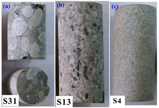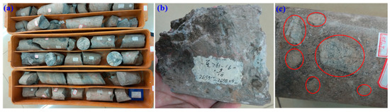 Glutenite cores drilled from a well in Shengli Oilfield: (a) Overview of glutenite cores and a more detailed view of the morphology of glutenite cores with (b) fine gravel and (c) coarse gravel.