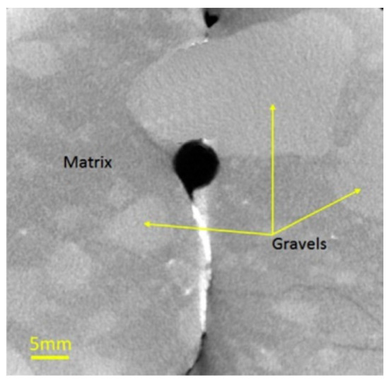 Brittleness is an important index for hydraulic fracturing design and implementation in tight glutenite reservoir exploration. Because of differences in mineral composition, diagenetic process, and in-situ stress distribution, the mechanical properties and brittleness of glutenite specimens are highly variable. Figure 3 illustrates the CT image slices of sandstone and glutenite core [11]. The glutenite core shows strong heterogeneity due to its composition and structure; randomly distributed gravel particles are observed, and the matrix is relatively homogeneous. Sandstone is noticeably more homogeneous than glutenite. The presence of randomly distributed gravel leads to the strong heterogeneity of glutenite, which differs from sandstone.