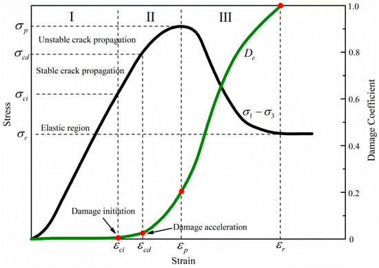 Figure 5 illustrates the damage evolution over the entire process of rock failure, which can be divided into three stages. (I) 0–, little damage occurs due to elastic energy accumulation. (II) –, the elastic energy accumulates to the extent that it exceeds the surface energy of microcracks; microcracks are generated and start extending, which initiates the damage. Energy starts dissipating slowly at first, as does damage evolution. As microcracks coalesce, structural failure of the rock specimen occurs, and damage starts to accelerate with a rapid accumulation of dissipated energy. (II) –, the elastic energy releases quickly, accompanied by a rapid accumulation of dissipated energy, further aggravating the damage until the failure of the rock specimen is completed.