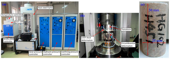 A series of uniaxial and triaxial compression experiments on glutenite specimens were conducted with an electro-hydraulic servo high-temperature and high-pressure dynamic triaxial test system (GCTS RTR-1500). Several components and corresponding parameters of the GCTS RTR-1500 triaxial test system (Figure 6) are as follows: a uniaxial loading system, (uniaxial loading range within 1500 kN), a radially deformed sensor, a digital acoustic analysis system, a confining pressure system (confining pressure up to 140 MPa), a pore pressure system (pore pressure up to 140 MPa), and a computer system. The experimental procedure complies with the International Society of Rock Mechanics (ISRM) standards.