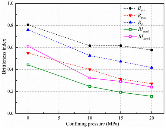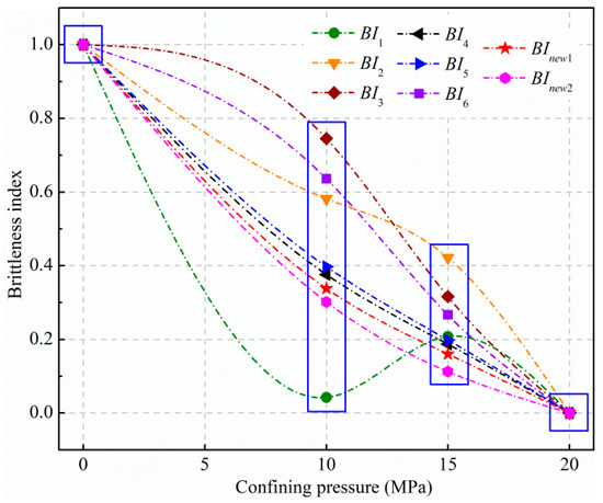 Relationships between confining pressure and brittleness indexes.