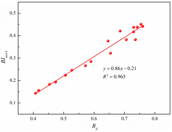 According to the analysis in the previous section, the brittleness indexes and are in good agreement with and , indicating that both indexes are reliable for brittleness evaluation of glutenite. Both of these two brittleness indexes take energy evolution characteristics of the pre-peak stage into consideration, using the proportion of total elastic strain energy to total mechanical energy absorbed by rock volume to reflect the brittleness of glutenite. More elastic strain energy can be stored in the pre-peak stage, while less dissipated energy can be produced for glutenite with strong brittleness. For the post-peak stage, is defined from the perspective of energy dissipation while is defined from the perspective of energy damage evolution. As analyzed above, damage generation and evolution are thought to be driven by energy dissipation; therefore, a damage variable is defined based on energy dissipation to reflect the damage evolution characteristic of the whole process of glutenite failure. uses the damage evolution rate to reflect the brittleness of glutenite, which establishes a connection between damage evolution and brittleness and is of innovative value. From the view of brittleness evaluation of glutenite specimens, the value of is slightly larger than that of , but the normalized values of the two indexes are very similar, which indicates the evaluation performances of two indexes are consistent. The two brittleness indexes each have a sound physical basis and clear physical meaning, and the parameters involved can be easily obtained from the stress–strain curve.