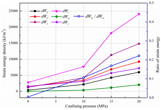 Strain energy density and strain energy ratio under different confining pressure.