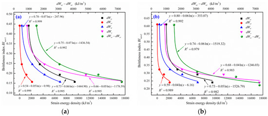 Correlations between strain energies and brittleness indexes (a) and (b) .