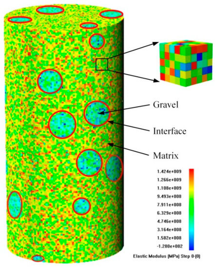The numerical model of glutenite specimen: 3D mesh distribution diagram of the elastic modulus.