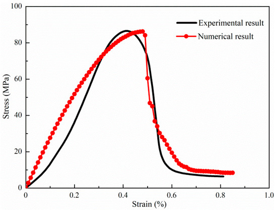 Comparison of stress–strain curves of specimen 1 between the experimental test and numerical simulation.
