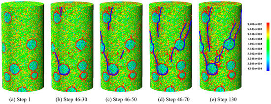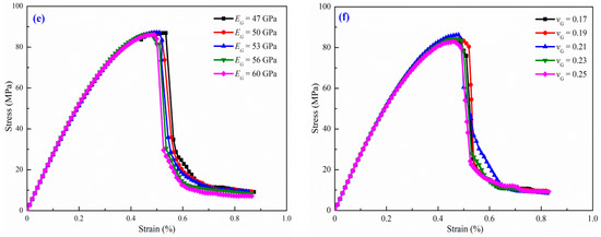 Figure 23 shows the stress–strain curves of five numerical cases with different gravel size gradations. The strength parameters and brittleness indexes of the five cases of different size gradations are listed in Table 7. Glutenite specimens with different gravel size gradations have almost the same elastic moduli, peak stresses, and residual strains. The residual stress decreases from Case 1 to Case 5, which indicates that a larger proportion of large-sized gravel leads to a smaller residual strength of glutenite specimen. Increasing trends of and are seen in Table 7. The brittleness indexes and of glutenite specimens increase with an increase in the proportion of large-sized gravel, which is in good agreement with the conclusions drawn in Section 5.2. When the gravel content remains constant, glutenite specimens with larger gravel sizes turn out to be smaller residual strength. Thus, from the numerical simulation results, the gravel size primarily affects the post-peak stress–strain characteristics of the glutenite specimen. The peak strength and elastic modulus of glutenite specimen remain almost invariant, while the residual strength decreases with an increase in gravel size, which results in an increase in glutenite brittleness. Fracture deflection by gravel can lower the fracture-tip stress intensity and enhance the fracture growth resistance, and the fracture may undergo a “shielding” effect [52,53,54]. When a fracture approaches large-sized gravel, it must accumulate more energy to overcome the resistance. Thus more released elastic energy at the post-peak stage is used to overcome the resistance and maintain the extension of fractures, which results in a decrease in residual strength.