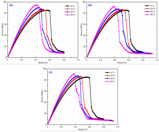 The glutenite specimens were machined into cylinders (diameter of 25 mm and height of 50 mm), and the ends were flattened on a grinding machine (Figure 5c). The maximum unevenness of the two ends did not exceed 0.05 mm. After placing a specimen in the three-axis chamber of the press, it was sealed with a rubber sleeve to prevent liquid from entering into the specimen’s interior, and then the pressure plate, the uniaxial and circumferential strain measuring devices, and the other parts of the press were installed. To ensure the uniform loading of the pressure plate on the surface of the specimen, a rubber gasket was placed between the pressure plate and the specimen. After installing the specimen, a confining pressure was applied to the set value for triaxial compression by the hydraulic regulator. The confining pressures were set at 0, 10, 15, and 20 MPa to analyze the variation of glutenite brittleness in response to the in situ stresses. The test was controlled by uniaxial deformation with a loading rate of 2 × 10−6 m/s until specimen failure. The stress–strain curves were automatically recorded in real-time by computer software.