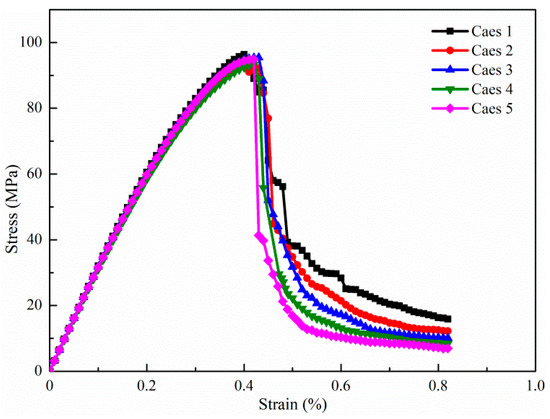 Stress–strain curves of five numerical cases of different gravel size gradations.