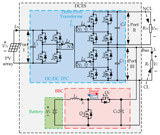 The topology is comprised of a DC/DC three-port converter (TPC) [13] and an energy storage unit (ESU). The TPC input port is fed by RES (or by a RES-prevalent grid), whilst the two output ports supply the NCL and CL separately. The ESU, in turn, is connected in parallel to the CL and is comprised of a bi-directional buck-boost converter (BBC) [14] and a battery; its task is to ensure the stabilization of the CL supply voltage while keeping the state-of-charge of the battery within predetermined limits. Hereafter, this DCES topology is referred to as a CL-paralleled (CLP)-ESU.