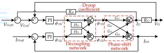 In Figure 4, since the CL voltage VC = ICRC and input port current IIN are influenced by both ϕ12 and ϕ13, a decoupling network is inserted in the TPC control [23] to eliminate the cross influence of the phase angles on the control of VC and IIN. A decoupling matrix H is designed to make GH a diagonal matrix to ensure one output is determined by one control input independently. As a result, two equations could be obtained as follows: