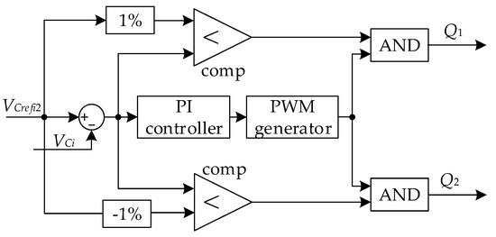 The BBC control for the ith DCES has the diagram in Figure 5, where the voltage reference VCerfi2 is generated by the secondary SOC control. It is worthy to note right now that, in general, VCerfi1 and VCerfi2 are different since they are generated respectively by the secondary voltage and SOC controls. The reference VCrefi1 is used to control the TPC and regulate the power consumption of NCL, while the reference VCrefi2 is used to change the operation mode of BBC and regulate the power of the battery. The switching signals of the BBC switches Q1 and Q2 are delivered by two logic AND elements triggered by the output of a PI controller through the PWM generator and the outputs of two comparators.