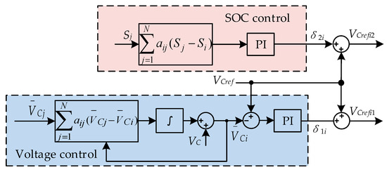 To realize the consensus of the SOC of the batteries in a multiple DCES, the SOC control of Figure 6 compels batteries with a high SOC to discharge faster and those with low SOC to charge faster. For this purpose, the following local state variable Si is defined for the SOC of the battery of ith DCES [19]: