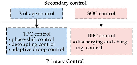 The primary control, also named the local voltage control, provides the independent voltage control of each DCES. It exerts into two control actions, namely the TPC control and BBC control. As shown by the scheme in Figure 3, the TPC control regulates the power flow from the RES to the CL and NCL by changing the phase-shift angle, whilst the BBC control aims for a power regulation of the CL.