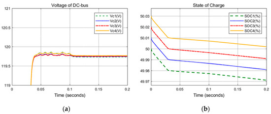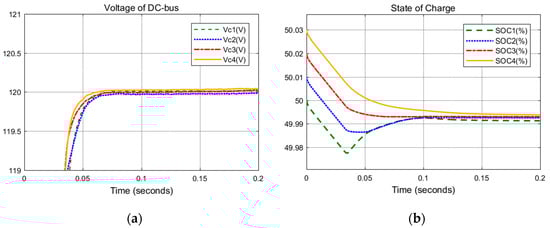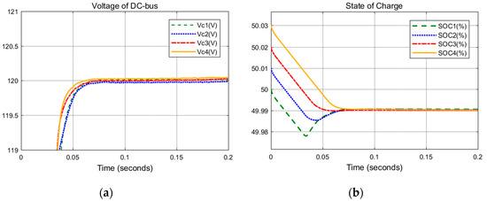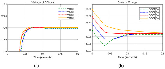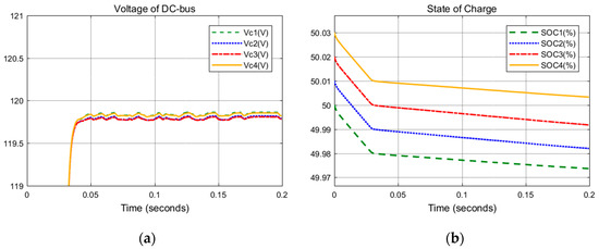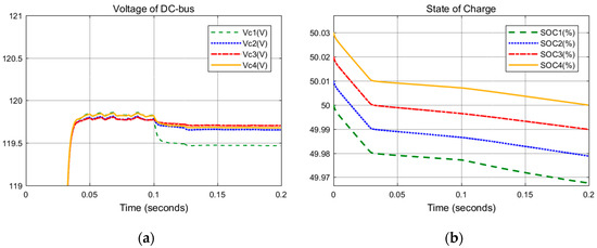 Distributed cooperative control of multiple DCESs: (a) DC-bus voltage; (b) battery SOC.