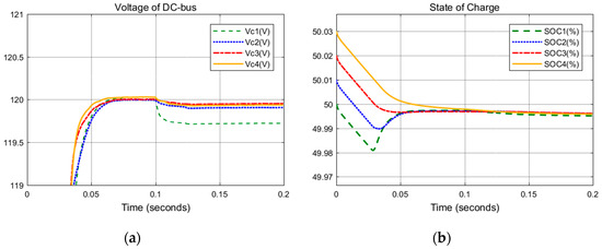 It can be seen in Figure 13 that the four DC-bus voltages deviated from the rated value especially after the load variation at 0.1 s. Moreover, the four SOCs are still different from each other. However, in Figure 14, with the distributed cooperative control, the four DC-bus voltages are in consensus, the average bus voltage can be regulated close to the rated value and four battery SOCs reach the consensus state although the load variation is at 0.1 s. This study indicates the good performance of the proposed control method when the CL load varies.