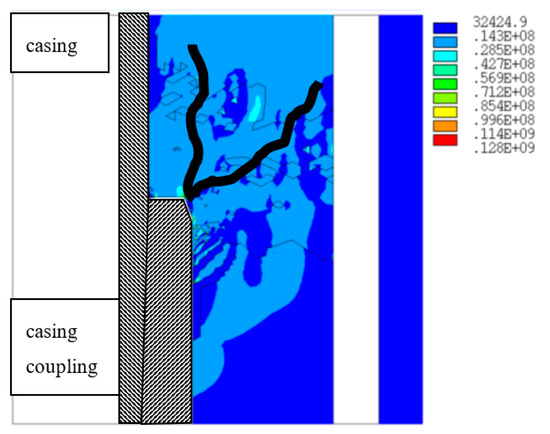 Using Finite Element Method, Kaldal et al. [16] and Teodoriu [8] have shown the importance of casing coupling—cement interaction, in which the maximum stresses in a temperature loaded well will always appear between the coupling edges and cement. Figure 1 shows the von Misses stresses obtained by [16] The results indicate that the failure mode of cement is most likely shear (please note the high stress concentration around the edge of the coupling). Teodoriu [8] has theoretically stated that the shear stress will probably propagate vertically or diagonally (see the marked lines in Figure 1). Due to the thin cement layer (normally between 10 and 30 mm), it is safe to assume that the shear failure will most likely propagate vertically.