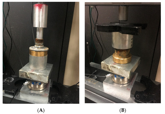 Views of the testing cells mounted in the press, the interfacial shear bonding strength (A) and the shear strength (B).