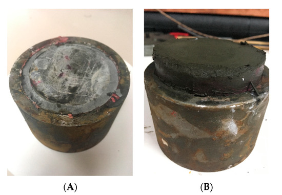 Shear strength specimens before testing (A) and after testing (B)—after testing the cement is pushed outside the mold.