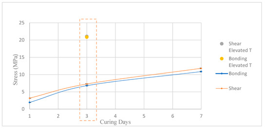 To verify if the data generated within this research is comparable with other published results, we compared our results with previously published data by [12,13,14,15,21,22,23,24]. However, the published data is limited and allows only a qualitative comparison. Also, only the interfacial bonding shear strength data could be compared since no previous work has proposed a pure shear test comparable with the ones performed in this work. Also, the literature study we had performed showed that commonly, interfacial bonding shear strength was measured after 1 day (24 h) and therefore, as presented in Table 3, the results found in this research for 1 day at room temperature show comparable numbers.