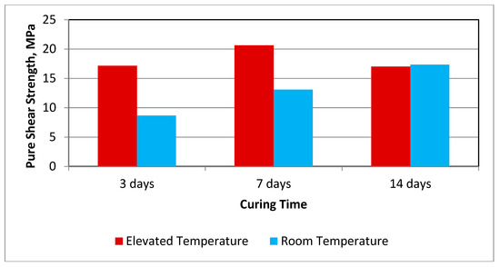 - Pure shear strength for specimens cured at elevated temperature is higher than that for specimens cured for the same days at room temperature, which was expected.