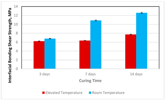 Similarly, the average pure shear strength value after 3 days of curing at room temperature was 7.28 MPa, while at an elevated temperature of 65 °C (±2 °C), a value of 21.04 MPa was obtained. The measured pure shear strength at elevated temperature shows a large variation between the first and the second attempt. We assume that this could be a result of curing temperature variance during the curing process. Later it was also observed that the cement batch of the second samples was different, showing slight differences from our preliminary experiments [25]. To avoid this, all other samples were prepared from the same cement batch and the same container, while the temperature was continuously monitored using a PC based data acquisition. Figure 6 shows the values measured for PSS and IBSS at elevated temperatures for 3 days curing compared to room temperature at 1, 3, and 7 days of curing. Figure 7 allows for a better comparison of the values measured at room vs. elevated temperature. Please note that the accuracy of our measurements is less than 1%, therefore the error bars are not visible in Figure 6.