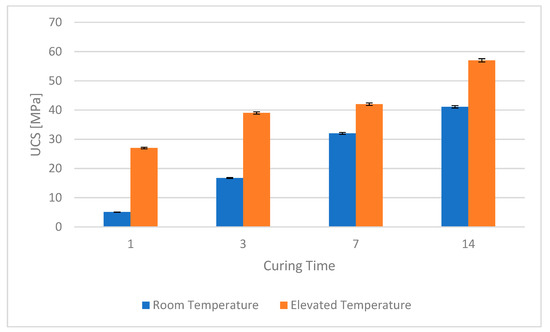 The evolution of unconfined compressive strength (UCS) of the cement measured at room and elevated temperature was used as reference for all other measured parameters and it is shown in Figure 9. The measured UCS of the cement (Class H) increases with time, and temperature leads to a higher UCS for the same day compared with room temperature. This behavior is normal and has been repeatedly reported in the literature. Also, the room temperature values for UCS are low but they are normal for neat class H cement. The increase of the UCS values infers that the other properties like interfacial bonding shear strength and pure shear strength will show the same tendency. However, our experiments have shown that the interfacial bonding shear strength does not change for samples cured at elevated temperatures, especially day 3 and 7. After 14 days of curing, a small increase of the interfacial bonding shear strength was noted, but the value is lower than the one obtained at room temperature. Although no similar tests have been found in the literature, the closest experiments we found were from civil engineering, related to rebar bonding to the cement, and they also showed a lower value at elevated temperatures.