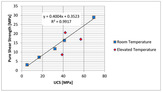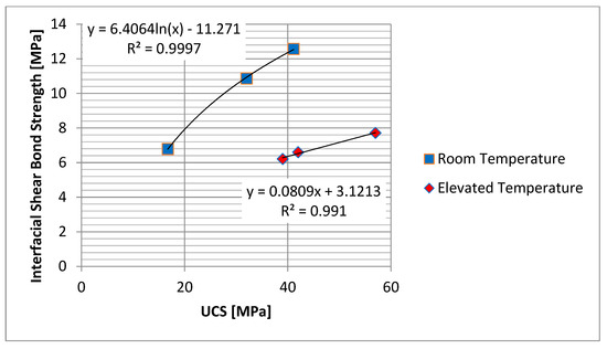 To further understand the behavior of cement pure shear strength and interfacial bonding shear strength, the comparison shown in Figure 10 and Figure 11 is provided. We have compared these properties with the UCS of cement under same curing conditions. Figure 10 shows a very good linear dependency between pure shear strength and cement UCS; however, when interfacial bonding shear strength is compared with UCS, it shows a strong non-linear behavior for elevated temperatures. UCS data are comparable with other published experiments [26,27]. Also as mentioned above, the pure shear strength data at elevated temperature shows a decline of shear with the increase of curing time. We also obtained the same results after repeating the experiments. Figure 11 shows the behavior of interfacial bonding shear strength. It can be observed that the bonding strength has a nonlinear behavior that is very strong at room temperature. A logarithmic trend line was found to fit very well this trend. The elevated temperature values are lower than the ones measured at room temperature conditions. Consequently, the bonding strength does not evolve continuously with the cement hydration, hence curing, but instead reaches a maximum value faster and stays constant. This has strong implications for the understanding of well integrity and long-term behavior of the well. Our experiments focused on 14 days curing time, but longer curing time experiments may prove this concept. Unfortunately, there are no similar experiments in the literature that would allow a comparison with the results in this paper.