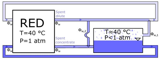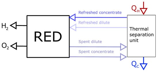 Closed-loop RED systems, using heat to separate the outlet solutions to the initial concentrations, have already been suggested in the literature. Tamburini et al. [] suggested multiple separation techniques both for water and salt extraction. For water extraction they suggested separation by evaporation with multi-effect distillation and membrane distillation, using an azeotropic mixture to lower the evaporation temperature and forward osmosis []. Among the salt extraction techniques, Tamburini et al. [] suggested a thermolytic salt (ammonium bicarbonate—AmB), where the salt is evaporated. The technique of evaporating the salt is also presented by other authors [,,], where Raka et al. [] found the energy needed per kg hydrogen produced to be 105–480 kWh. Membrane distillation as a separation technique with RED is also mentioned by Long et al., using sodium chloride [].