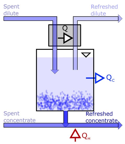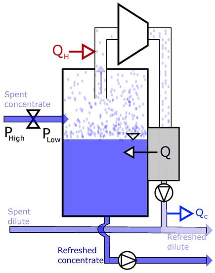 A sketch of a principle separation system using evaporation is shown in Figure 3. The spent concentrate solution is decompressed until the water evaporates with limited need for external thermal energy (Q). External low-grade heat, , is added to the vapor to keep the gas form condensing before the gas is compressed. The gas transfers thermal energy to the spent concentrate solution to maintain the temperature, represented by Q in Figure 3. The evaporation will continue until the initial concentration in the solution is recovered, where the evaporated water is added to the outlet dilute solution from the cell. Pumps are needed in to depressurize the container.