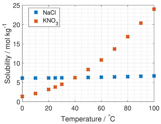 The concentration of the concentrated inlet solution in RED is limited by the solubility of the salt at the RED operating temperature (40 C), but due to more documented data in the literature at room temperature, all measurements and modeling are also carried out at 23 C for reference. The concentration for the dilute solution in RED, when using precipitation as the separation technique, is set by the solubility of the salt at the temperature used in the separation (10 C). The solubility of KNO and NaCl is found from CRC Handbook [] (unit: wt% per mass solution) and calculated to molality (formula in []). The data is plotted in Figure 4.