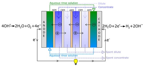 By stacking the membranes, as shown in Figure 5, the voltage can be increased enough to enable water splitting (in the aqueous rinse solution) [,]. The water splitting reactions (also given in the figure) are: