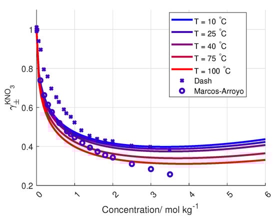 To the author’s knowledge, the activity coefficient of KNO is only measured at 25 C and up to salt concentrations of 3.5 mol kg, by Dash et al. and Marcos-Arroyo et al. [,]. Their experiments were similar, but Dash et al. used double junction reference electrode, while Marcos-Arroyo et al. used single junction. The modeled activity coefficient from Stokes–Robinson equation (Equation (4)) is plotted in Figure 6 together with the data from Dash and Marcos-Arroyo.