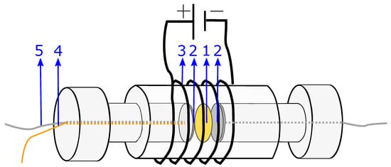 Sketch of the measurement cell for membrane conductivity, with (1) membrane sample(s), (2) platinum plates, (3) heating wire, (4) end of the thermocouple emerging from the cell, (5) end of the platinum wire (attached to the platinum plate) emerging from the cell.