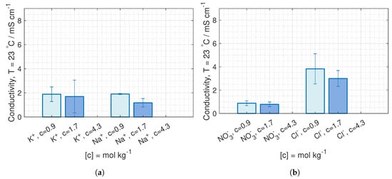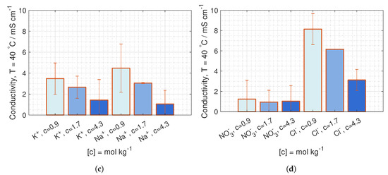 Smaller particles should theoretically have a higher diffusion coefficient []. However, a smaller ionic radius has more charges per area on the surface of the ion, bringing more water molecules with it [], increasing the hydraulic diameter. This results in two effects on the conductivity. The first effect is increased membrane wetting, where more water increases the conductivity. The second effect is that the physically larger ion will lower the diffusion coefficient. The crystalline and the hydrated radius of Na, K, Cl and NO are found from [] and given in Table 2.