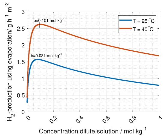 The solubility for KNO is 2.11, 3.16 and 6.22 mol kg at 10 C, 25 C and 40 C respectively, and 6.11, 6.15 and 6.22 mol kg at 10 C, 25 C and 40 C respectively for NaCl. The relevant dilute concentration for the evaporation process is not limited by solubility, but optimised for maximum hydrogen production with modeling.