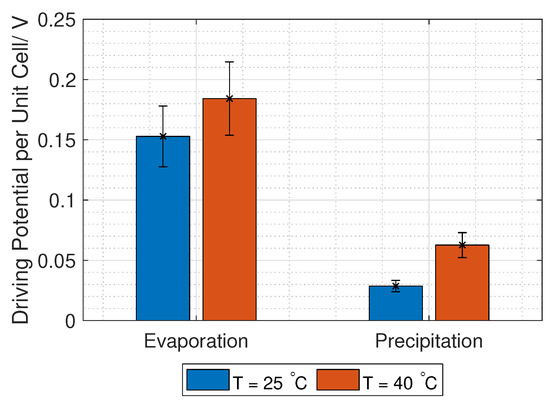 The driving force in RED using concentrations relevant to evaporation is 5 and 3 times higher than for the system relevant for precipitation at 25 C and 40 C respectively. However, due to lower dilute concentration in for the evaporation process, the resistance of the dilute compartment is 30 times higher for the concentration relevant for evaporation versus precipitation, increasing the total unit cell resistance by 30%.