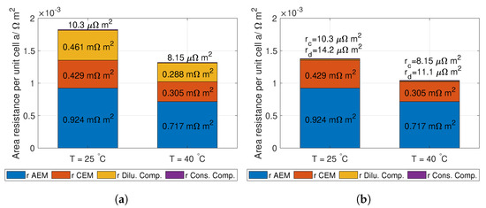 The ionic conductivity in the membrane in Equation (14), depends on the concentration and diffusion coefficient for both the counterions and co-ions [] (Equation (8)). The concentration of counterions in the membranes is dependent on the fixed charges, and the amount of salt and water absorbed in the membrane pores [,]. The fixed charges are quantified by the ion exchange capacity (IEC) and are given as mmol g, and are constant (per membrane weight) with concentration. By increasing the IEC, the hydrophilicity of the polymer chains in the membrane increases and with it the water uptake. Water makes the membrane swell, reducing the density of the fixed charges in the membrane and increasing the adsorption of ions in the membrane. For the two membranes used in the experiments in this article, the IEC is 1.2–1.4 for CEM and 1.6–2.0 mmol g for AEM [,], indicating a slightly better conductivity in AEM than CEM.