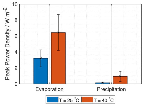 The cost per kg of hydrogen produced can be estimated by including the membrane cost, which is assumed to be the most expensive part of the RED-stack materials [], and the cost of the salt. This is a simplification, and for a future study other costs should be considered, e.g., the cost of the separation unit. Assuming a membrane price of 170 $ m and a membrane lifetime of 4 years [] the price for producing 1 kg of hydrogen is 55 $ and 370 $ for the evaporation and the precipitation process respectively. To compete with the cost of producing hydrogen using electrolysers, 4.2–14 $ kg [], the membrane price needs to cost less than 43 $ m and 6.5 $ m for the evaporation and precipitation process respectively. The cost of KNO is 78 $ kg, and the amount of salt inside the RED-stack is 1.3 kg m and 4.7 kg m for the number of unit cells relevant for the evaporation and precipitation system, respectively. Assuming the doubled amount of salt is needed for the entire Heat to H-system and the system can operate for 100 years (membranes need to be changed more often), the cost of the salt is 0.043 $ and 0.371 $ per kg hydrogen produced using the evaporation and precipitation system respectively. In the present Heat to H-system the price of the salt is negligible compared to the cost of the membranes. Raka et al. [] found the contribution from heating to be over 50% of the total cost in a system similar to the one presented here. Obtaining the heat at an energy price of 0.15 $ per kWh [], the cost of the heating per kg hydrogen produced is 100 $ using the evaporation process and 16 $ using the precipitation process.