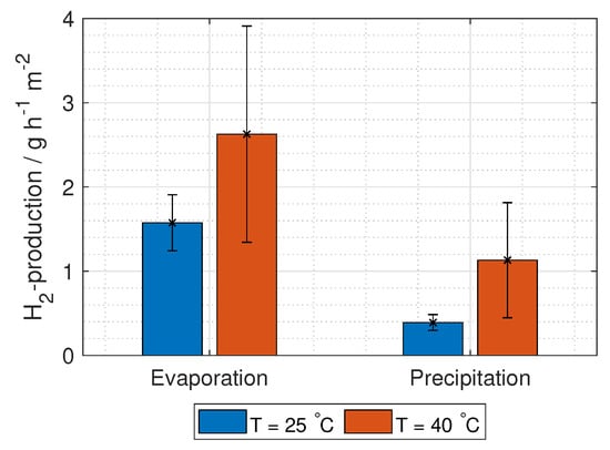The hydrogen production is calculated using the current at maximum power density, and a total RED stack potential of 1.33 V. The production of hydrogen using concentrations relevant for the evaporation process is 4 and 2 times higher than for concentrations relevant for the precipitation process at 25 C and 40 C respectively. From a cost perspective the evaporation process is preferable over the precipitation process due to a higher hydrogen production per membrane area, while from an energy demand perspective the precipitation process is the superior separation technique. The energy needed per cubic meter of hydrogen produced is 55 ± 22 kWh for the evaporation process and 8.22 ± 0.05 kWh for the precipitation process. The most common renewable source of hydrogen production today is PEMWE, which stands for 4% of the world’s total hydrogen production []. The results from the measurements and the modelling in this article present an alternative renewable way to produce hydrogen with an energy consumption comparable to PEMWE, where the input energy is otherwise lost low-grade waste heat.
