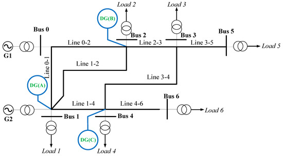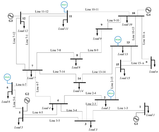 In our methodology, we assume that we have a general electrical system, as shown in Figure 1, which consists of many generators, G1, G2, G3, etc. which feed many loads through transmission lines between busbars. These loads are connected to n busbars. In this electrical system, there are also many DG units equipped with converters.