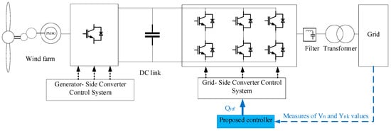 The DG units used in this research are wind farms type 4 [32], which consist of a permanent magnet synchronous generator PMSG and have a full-scale converter. These wind farms are capable of generating both active and reactive power separately. The structure of the control system is illustrated in Figure 2. The input signals of the controller are the measured values of voltage and admittance, and the output control signal is .