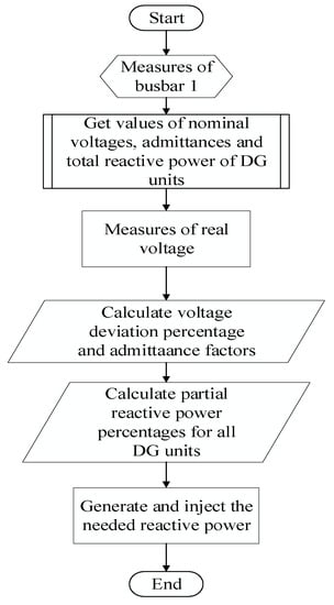 DG units are equipped with converters so, they are capable of changing the angle between voltage and current consequently the generated reactive power. In smart grids, obtaining a steady and stable voltage with small voltage variation from the nominal voltage is very important, especially for highly sensitive electronic devices. In our methodology, DG units have been controlled to produce reactive power according to the voltage deviations of busbars and the varying admittance factors between busbars and DG units. To compensate for any increase in voltage deviation, we need to increase the generated reactive power. In the same vein, the generated reactive power must come from the closest DG unit which will have the highest value of the impedance factor. For the first busbar, the voltage deviation percentage is —thus, the generated reactive power as a percentage value is given according to the following Equation: