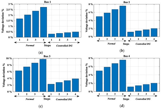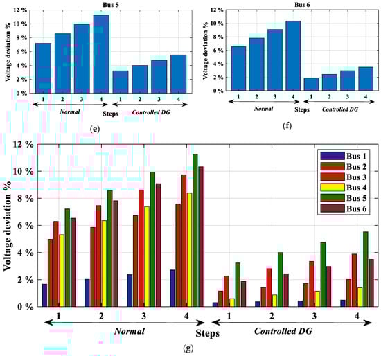 Figure 6g and Table A4 illustrate the voltage deviation percentages for all buses in the two cases (Normal) and (Controlled DG). For four steps of load values, we can notice the significant impact of the controller in decreasing the voltage deviation percentages and thus improving voltage quality and profile.