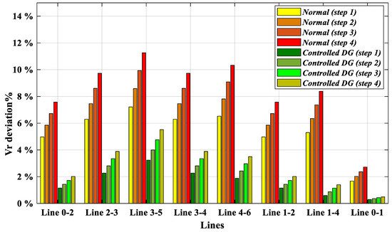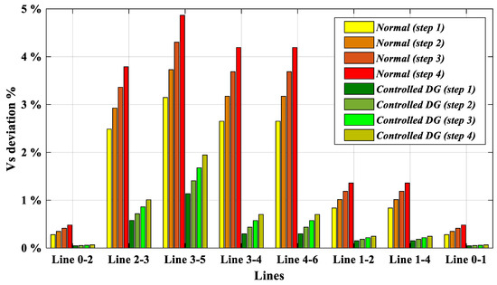 Figure 7 and Table A5 show the percentage values of the sending voltage deviation for all transmission lines in both cases (Normal and Controlled DG) and for four steps of load values. It is obvious that the lowest percentage values of voltage deviations are for lines 0–1 and 0–2 as they are the closest lines to busbar 0 which is the slack bus. Further, voltage deviations for lines 1–2 and 1–4 are relatively low because they are located between two DG units. We can also notice that the highest percentage values of voltage deviations are for lines 3–5, 3–4, 2–3, and 4–6 because they are the farthest lines from the slack bus and main generators G1 and G2. In addition to that, lines 3–5 and 4–6 are radial branches. In fact, the most important thing in these results is that the impact of the DG unit’s controller is still clear as it was able to decrease the percentage values of voltage deviations significantly, even for the farthest and radial transmission lines like 3–5, 3–4, and 4–6. For lines 3–5, the highest voltage deviation in the (Normal) case is about 10%, while for the (Controlled DG) case, it decreases to less than 4%.