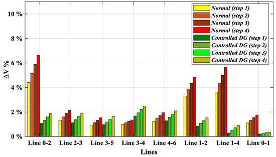 Figure 9 and Table A7 show voltage drop percentage values for all transmission lines in both cases (Normal and Controlled DG) and for four steps of load values. The most noticeable impact of the DGs unit’s controller is for lines 0–1, 0–2, 1–2, and 1–4, as these lines are located between two DG units or one DG unit and the slack bus. Despite this, we can notice that the voltage drop for lines 3–5 and 4–6 in the (Controlled DG) case is slightly higher than (Normal) case and relatively higher for line 3–4—but this does not mean that the (Controlled DG) case for these lines is worse than the (Normal) case because these differences between voltage drop values in the two cases are due to the differences in the improvements of sending and receiving voltage values for these lines, where the controller improves the sending voltage more than receiving voltage. For example, for line 3–4, step 4, the sending voltage was 60.467 kV in the (Normal) case and it becomes 65.074 kV in the (Controlled DG) case with an improving value (4.607 kV), whereas the receiving voltage was 59.576 kV in the (Normal) case and it became 63.432 kV, so the improving value is 3.956 kV.