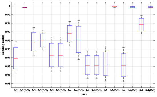 In Figure 10 and Table A8, we can see the sending cos(φ) values for all transmission lines in both cases (Normal) and (Controlled DG) and for four steps of load values. We can notice the considerable influence of the DG unit’s controller compared with the (Normal) case specifically for lines 0–2, 1–2, 1–4, and 0–1 where the sending cos(φ) values are remarkably better than the (Normal) case, also very close to 1, and the change’s range during the ascending process of the load is very narrow. For example: cos(φ) values for line 0–2 ranges between 0.928 and 0.952 in the (Normal) case, while in the (Controlled DG) case, all the values are about 0.998. The great improvement of cos(φ) values for these lines is due to the fact that all of them are located between two DG units, or between a DG unit and the slack bus. For the rest of the lines, we can notice that the sending cos(φ) values are relatively close to each other.