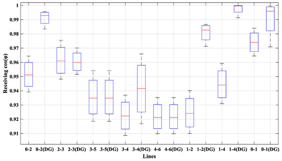 Figure 11 and Table A9 show the receiving cos(φ) values for all transmission lines in both cases (Normal and Controlled DG) and for four steps of load values. The results for the receiving end are similar to the sending end where we can observe the same improvements of receiving cos(φ) for the same lines 0–2, 1–2, 1–4, and 0–1 but the range is relatively wider and the values are relatively lower than sending end results. For the remaining lines, the results are also close to each other for both cases, except line 3–4 where the receiving cos(φ) values for the Controlled DG case are better than the Normal case.
