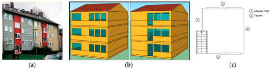(a) Multi-family house constructed between 1958–1968 [18]; (b) Front side (left) and backside (right) of the building model used in simulations; (c) Home plan.