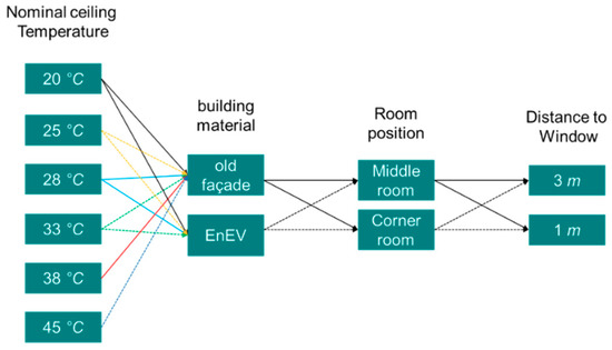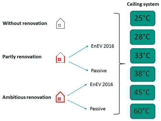 Figure 2 presents combinations of 30 scenarios for five different types of renovation and six operating temperatures used for the transient simulation of a radiant heating ceiling. The first scenario is a reference building that reproduces the real construction design described in Section 2.1, the second is a type of renovation, called partial renovation, which is regarded as a building construction with improved external walls’ insulations and windows’ quality, and the third is an elevated type of renovation called ambitious renovation, where the level of restoration is higher, affecting every surface of the building model. The simulations involving renovations were performed with respect to two energy-efficiency standards (EnEV 2016 and Passive House Standard) that define different U-values for materials used in the refurbishment. This included external and inner (ceiling and floor) walls, as well as the roof and windows. The U-values of the building model components together with the thermal heat capacities of the building envelope are presented in Table 3. For comparisons, since the heat capacities of insulation materials are negligible compared to the relatively high heat capacities of the existing building envelopes, the heat capacities of the building envelope for all types of renovation scenarios are equal to those from the reference building. In terms of the warm ceiling, the temperature of supply water ranges from 25 °C to 60 °C, where the upper limit represents the supply temperature of conventional radiators.